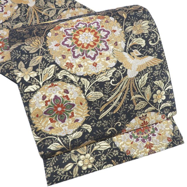 - 袋帯 中古 リサイクル 正絹 フォーマル 仕立て上がり 六通 勝宝綾錦 花鳥模様 花紋 華文 箔糸 黒色 多色 金 きもの北條 A1194-13