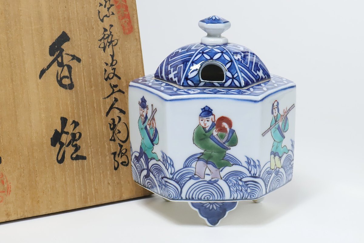 ・館林源右衛門 染錦波上人釣絵 香爐 共箱 /有田焼 香炉 香道具 華道具 茶道具 染付