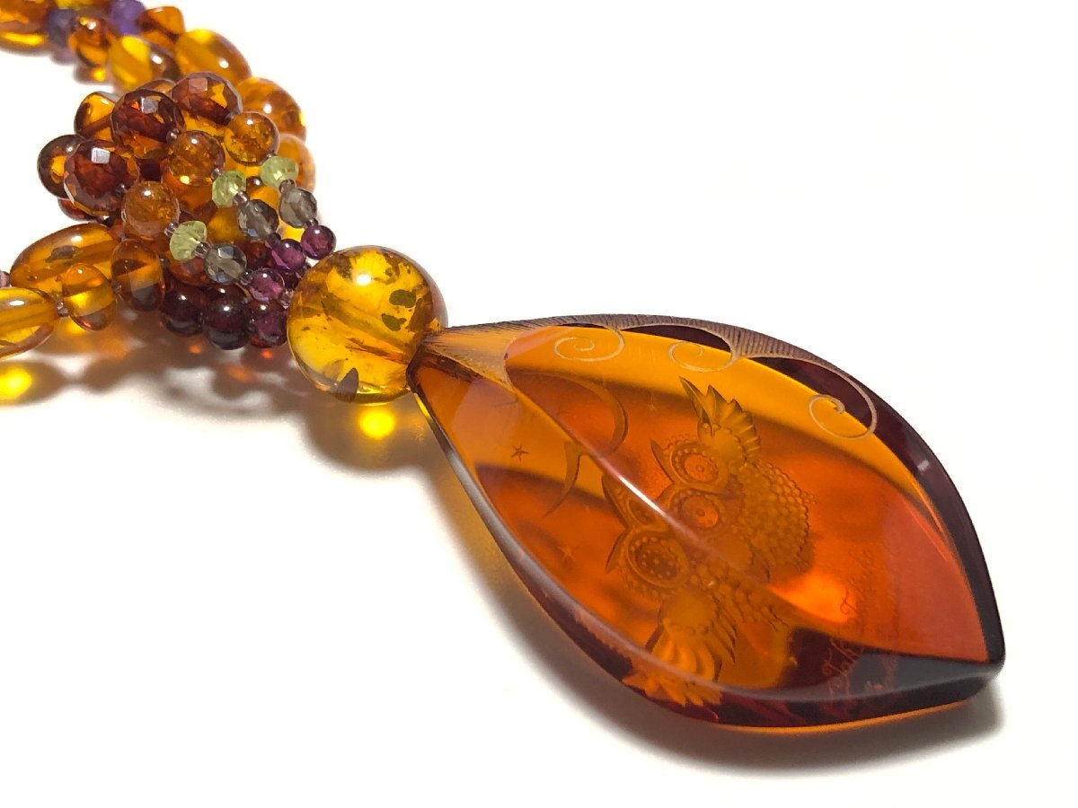 > 本琥珀 ペリドット アメジスト ネフライト K18 24.0g 作家物 セルゲイ・G・ワインコフ インタリオ 梟細工 デザイン ペンダントネックレス