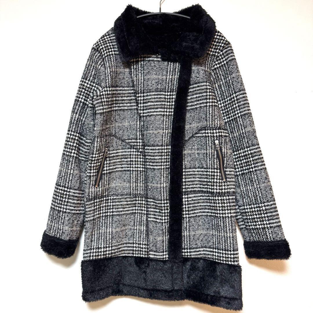 - ファーコート 裏起毛 Mサイズ アウター レディース ブラック チェック レトロ