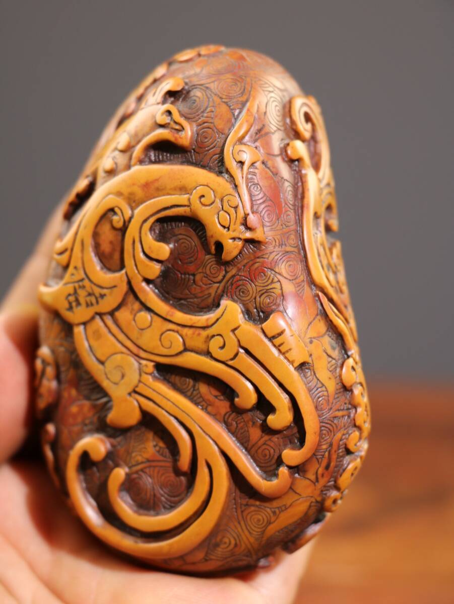 - 『館蔵珍品 寿山石 田黄石 細密彫 鳳來儀印章 印章 印鑒』文房具 書道品 貴重物品 収蔵品 中国古美術 時代物 古董品
