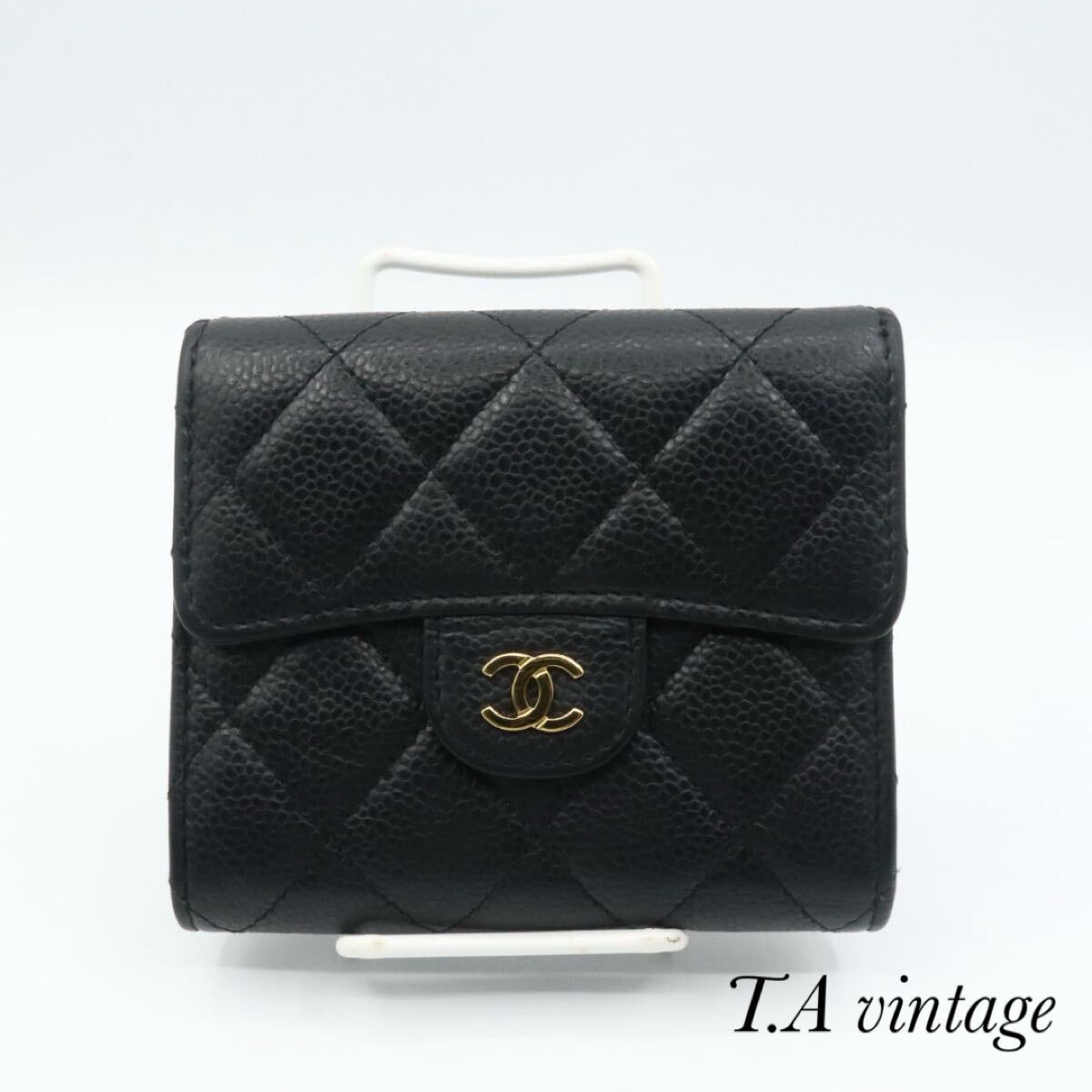 - CHANEL 新型 美品 シャネル キャビアスキン マトラッセ 折り財布 ブラック ブラウン