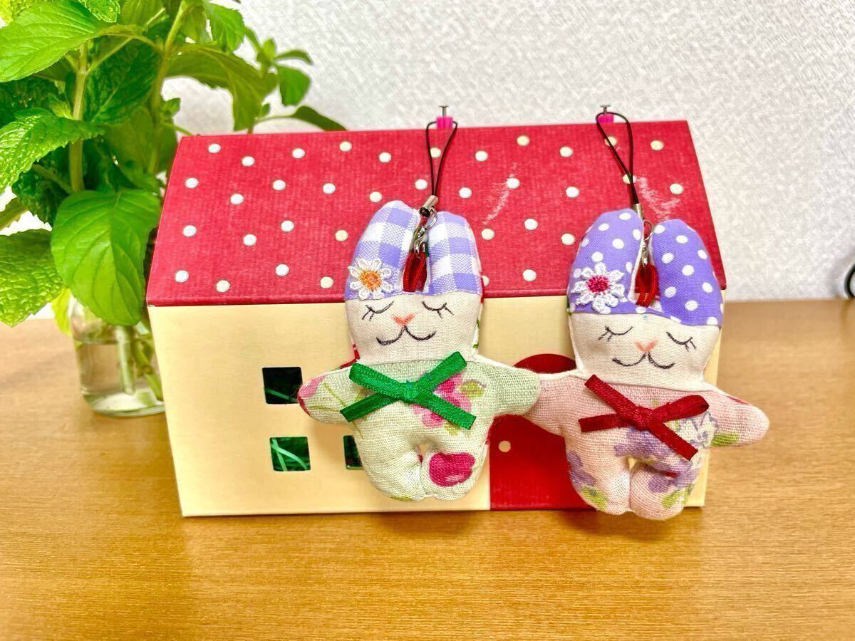 - ハンドメイド ★キーホルダー★ペアさくらんぼ柄のうさぎちゃん