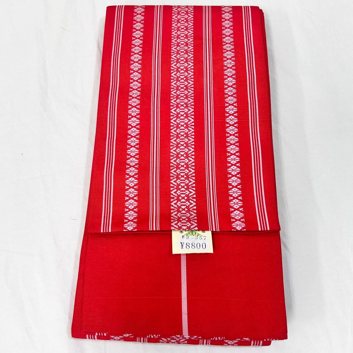 > ★未使用★森博多織 本場筑前博多織 証紙付 吉弥帯 博多帯 正絹 半幅帯 浴衣帯 帯 夏帯 朱色 巾15cm 長さ356cm 着物 浴衣 女性 (05257③並