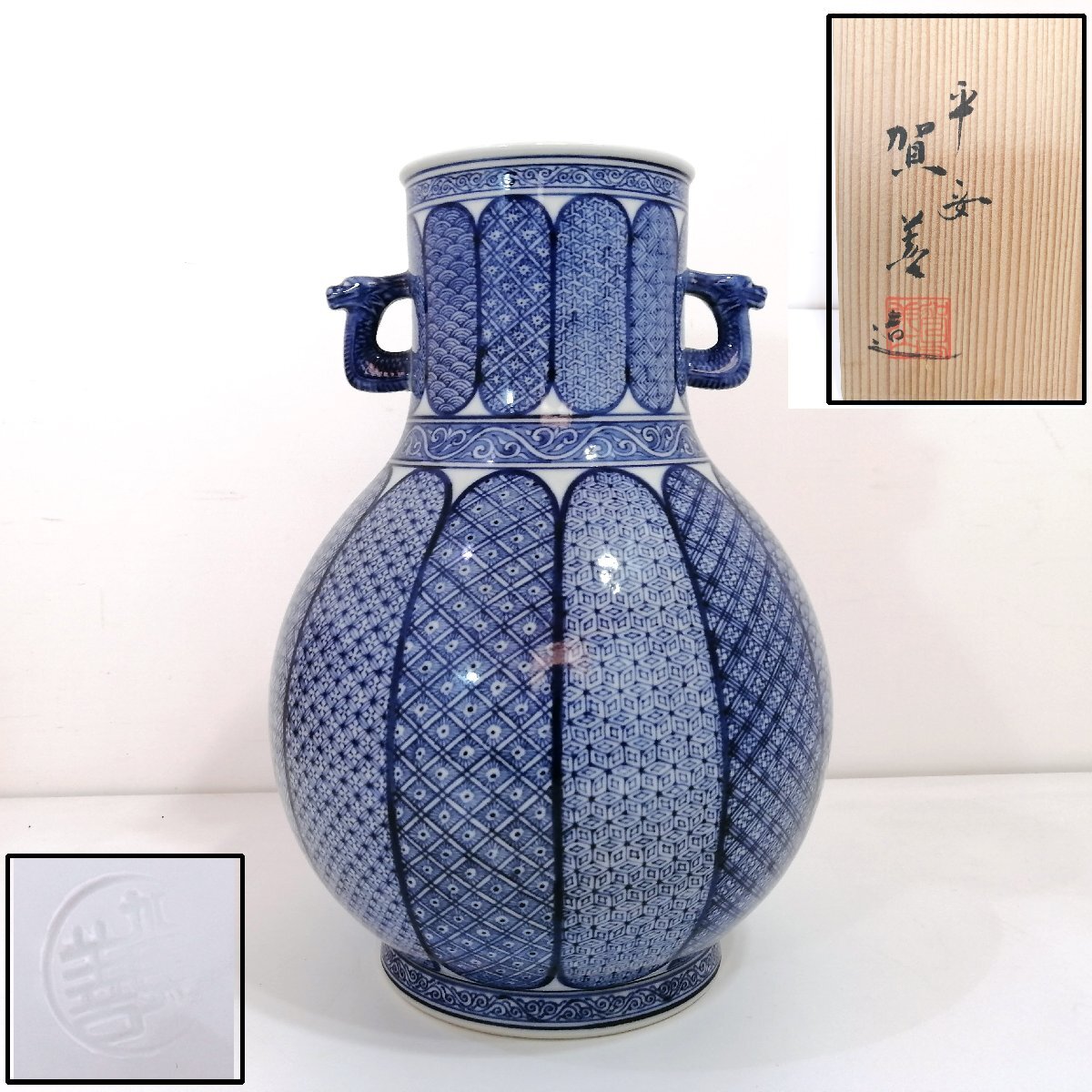 > 真作保証■北村賀善 造 平安 花生 青華祥瑞文 清水焼 京焼 名工 共箱付 幅20×高さ29cm コレクター放出品 ③ Japanese pottery Old Vintage