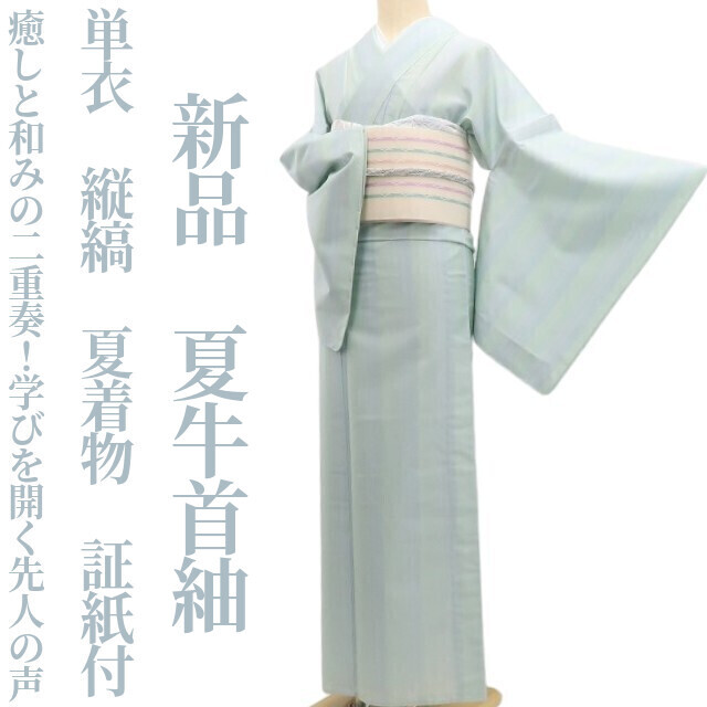 - tomihisa 新品 単衣 縦縞 夏着物 正絹“癒しと和みの二重奏!学びを開く先人の声”証紙付 仕付け糸付 夏牛首紬 5839