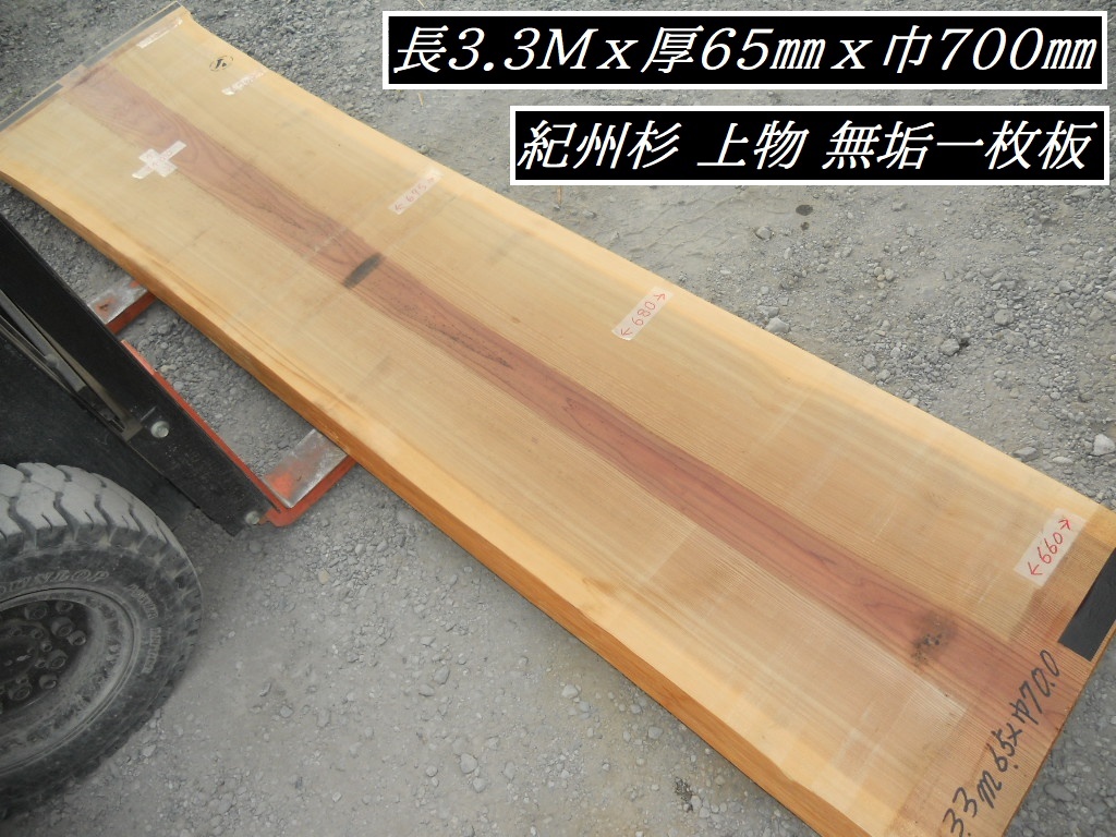 > 紀州杉 上物 長物340cmX72~89cmX6.7cm ム節上小 無垢一枚板 カウンターテーブル材料 座卓天板素材 天然木 耳付き 中杢 上品 木材 乾燥材