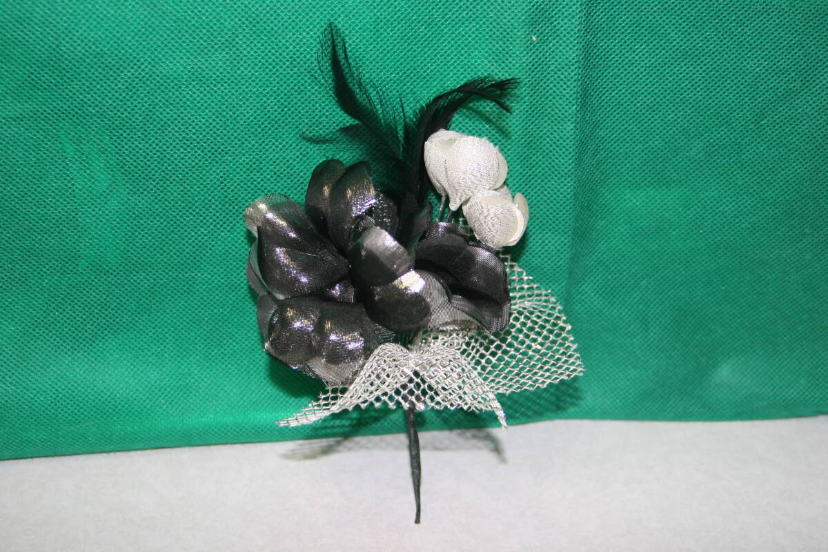 - コサージュ 黒の羽付き 黒と銀の花 ブラック × シルバー 約15cm シルバーレース☆卒業式 謝恩会 入学式 演奏会 フォーマル
