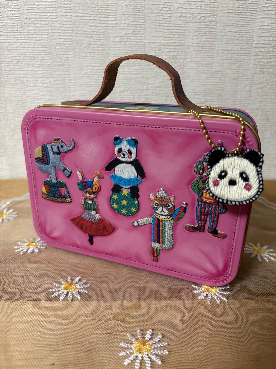 - 【缶のみ】青山デカーボ 刺繍模様バッグ缶 パンダ刺繍マスコット付き ぱんだ・プードル・ネコ・ウサギ・ゾウ・玉乗りパンダ