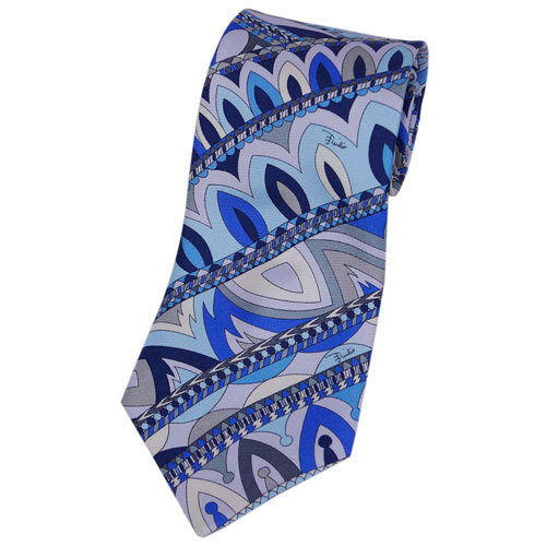 > 未使用 エミリオ・プッチ ブランド ネクタイ EMILIO PUCCI プリント デザイン シルク 100% ブルー ネイビー ライトパープル