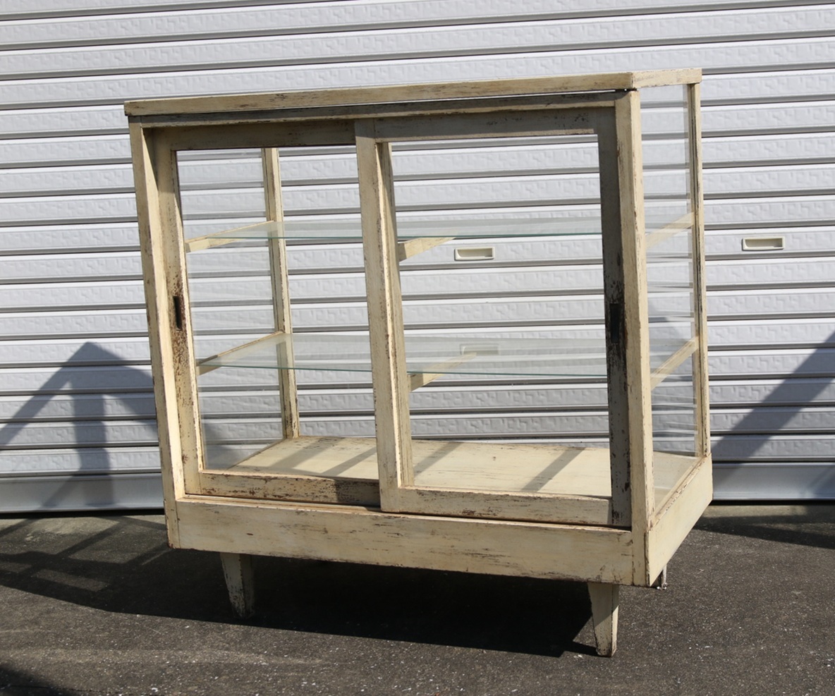 - 横長脚付木製ガラスショーケース 昭和レトロ 什器 お洒落ディスプレイ棚 店舗 ヴィンテージ 引取り・配送業者手配可能な方限定で