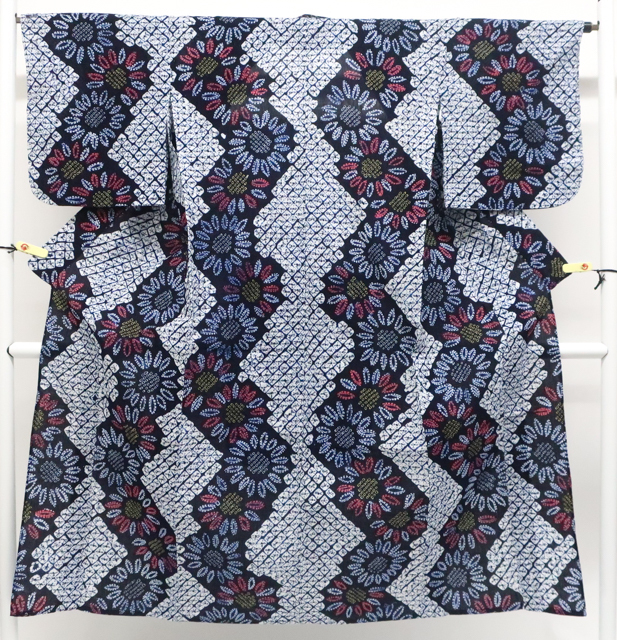 - 《古美術京松》【着物】 浴衣 昭和レトロ 有松絞り 向日葵文 身丈約148cm 裄丈約65.5cm r7z05-495