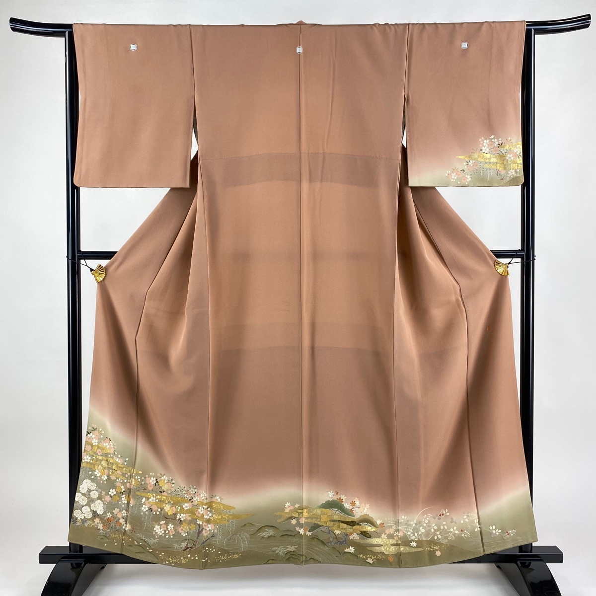 > 【在庫一掃】 訪問着 身丈158cm 裄丈64.5cm M 袷 落款 草花 霞 金彩 ぼかし ピンクベージュ 正絹 美品 秀品 三つ紋 【中古】