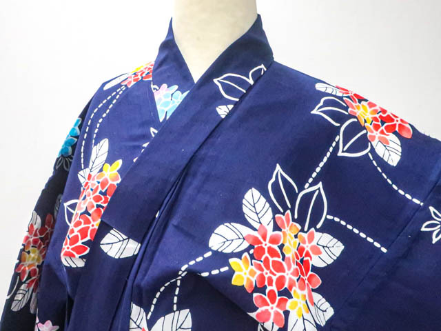 - 《古美術京松》【着物】浴衣 昭和レトロ 花文 身丈約149.5cm 裄丈約64cm r7z06-526