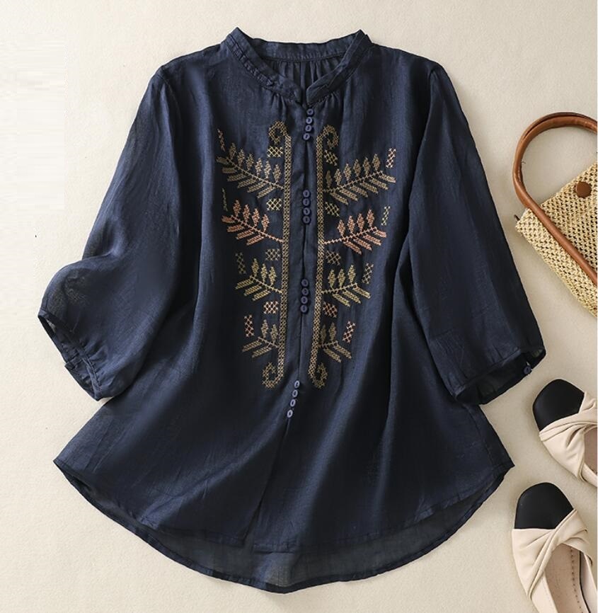 - 新入荷*大きいサイズ ブラウス 大人 刺繍入り シャツ ブラウス ゆったり 上質 おしゃれ 通勤 OL 女性着 大人 可愛い チュニック*ネイビー