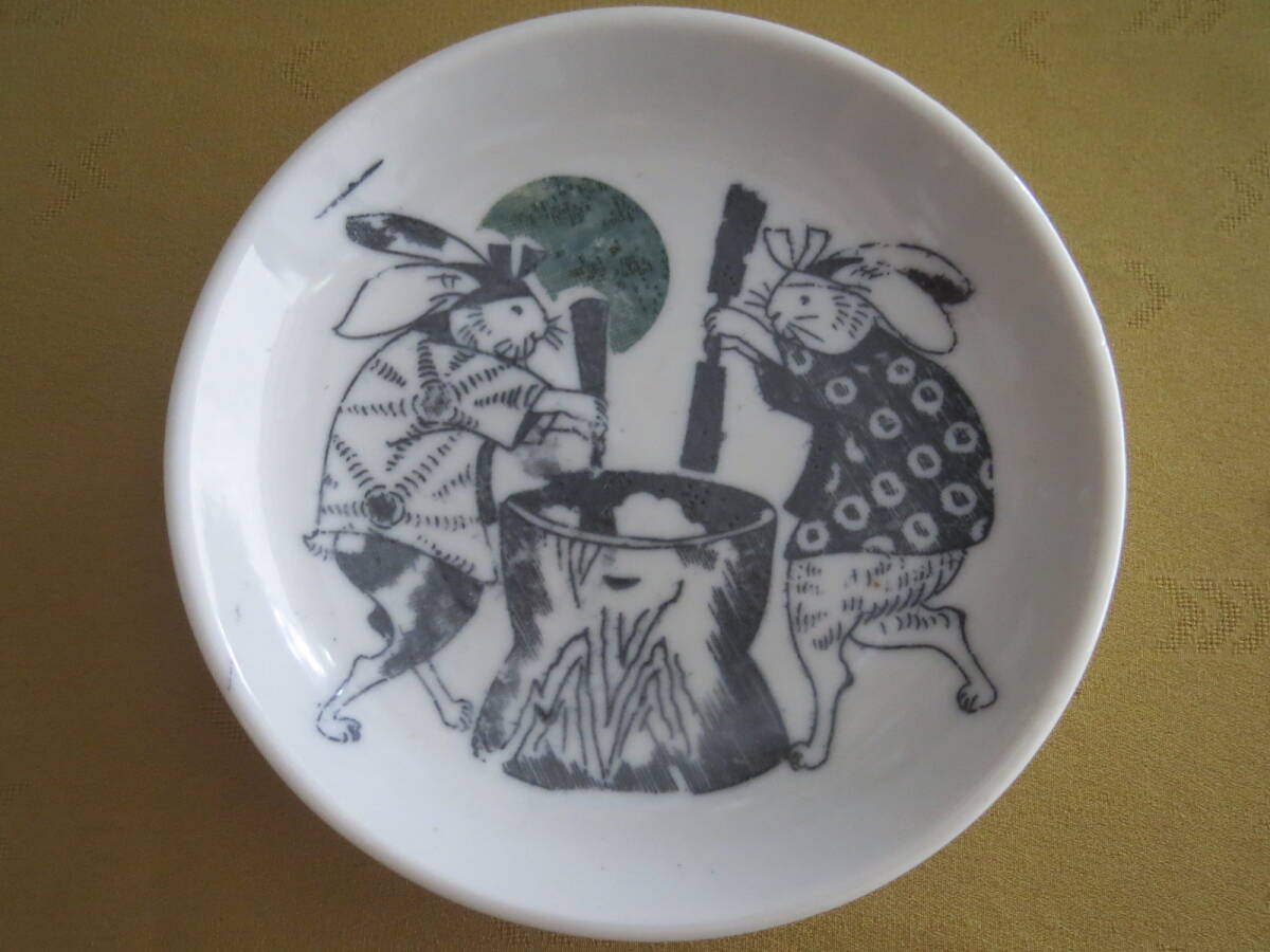 - 印版 皿 餅つき兎 緑の月 うさぎ 手塩皿 大正期 b