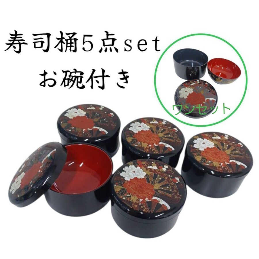 - 高136【5客set】漆器 ちらし寿司セット 寿司桶 おひつ お椀 5客 吸物椀 蓋付 キッチン用品 食器 和食器 250604