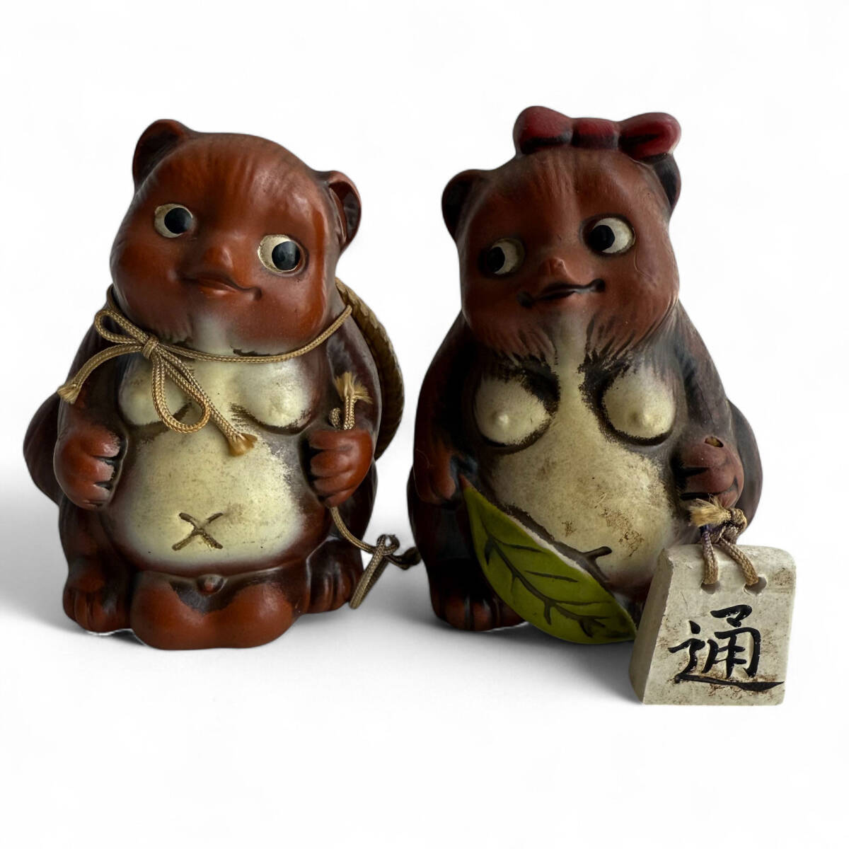 - N7-740 陶器 ミニ 狸 置物 2体セット ペア たぬき タヌキ