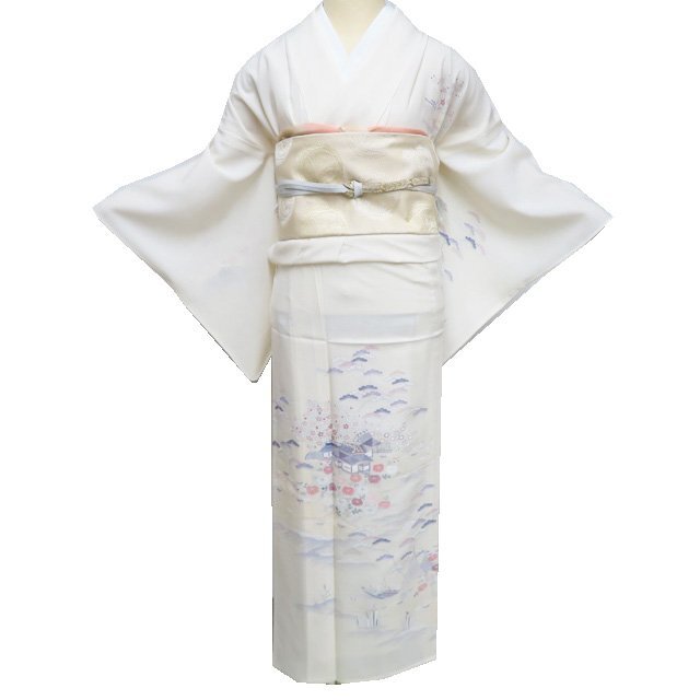 > 夏物 夏着物 訪問着 着物 中古 フォーマル 紋付き 茶屋辻文様 地模様 練色 多色 銀 身丈156.5cm 裄63cm M きもの北條 A1202-13