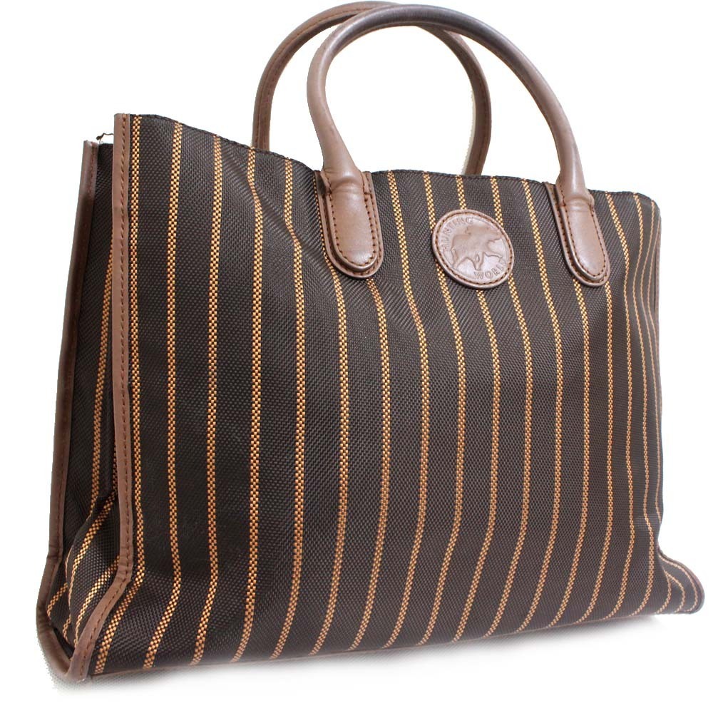 > ハンティングワールド ストライプ トートバッグ ユニセックス ナイロン レザー ブラウン 中古 送料無料 HUNTING WORLD