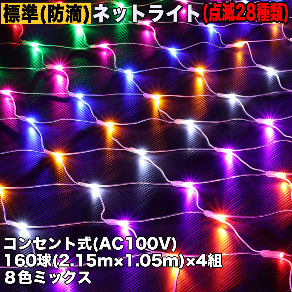 - クリスマス 防滴 イルミネーション ネット ライト 網状 LED 640球 (160球×4組) 8色 ミックス 28種点滅 Bコントローラセット