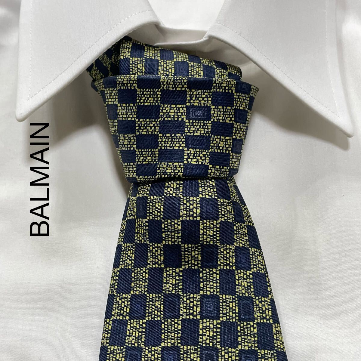 - BALMAIN バルマン パターン柄 デザイン シルク ネクタイ フランス製 イエロー ネイビー TG1592