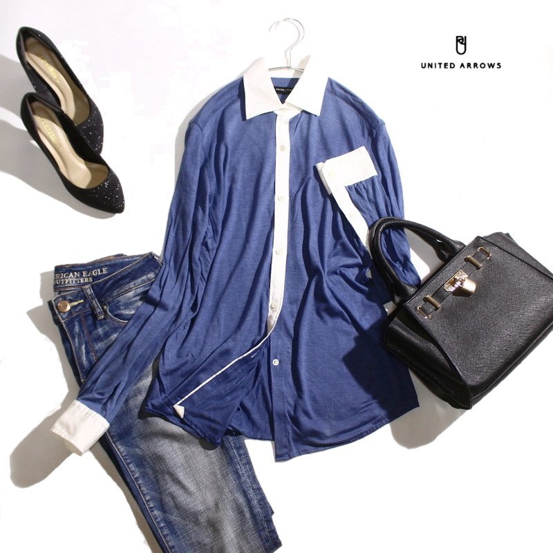 - 美品 ユナイテッドアローズ UNITED ARROWS 春 夏 ストレッチ Tシャツ × シャツ 切替 長袖シャツ 9号 38 ネイビー 紺 ホワイト 白 綺麗め