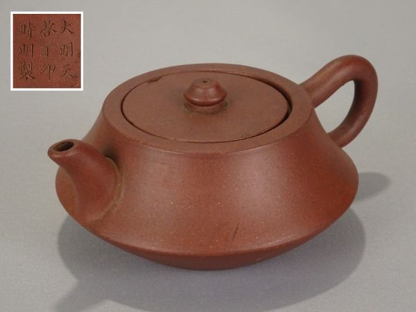 - 〔聖〕唐物 煎茶道具 身底 大明天啓丁夘時明製 款 『 大振 朱泥 単孔 急須 』 紫砂壺 茶道具 煎茶 中国古玩 【宜興 水平壷 孟臣 紫砂】