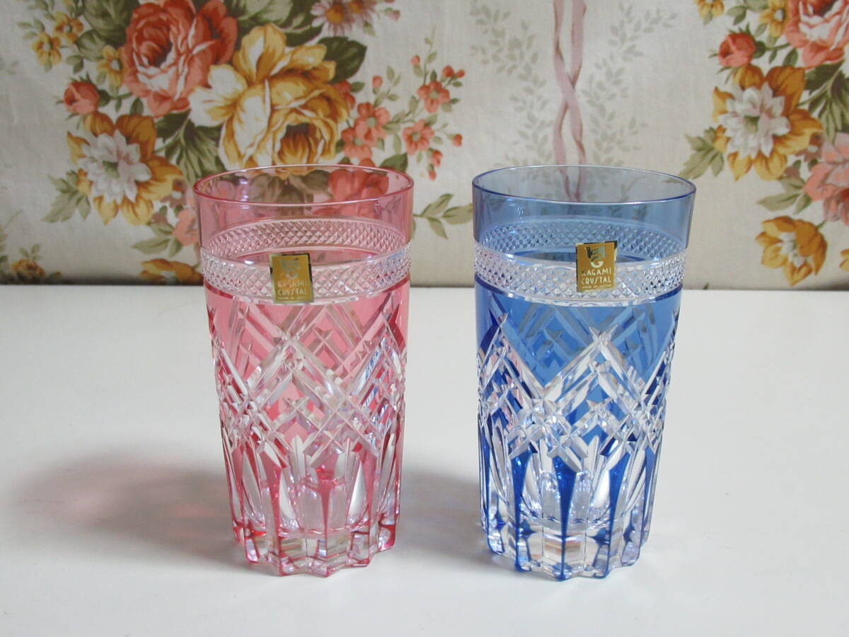 - R7 06★カガミクリスタル★ タンブラーグラス2客セット ペア(ピンク・ブルー)★切子 素敵なカット!
