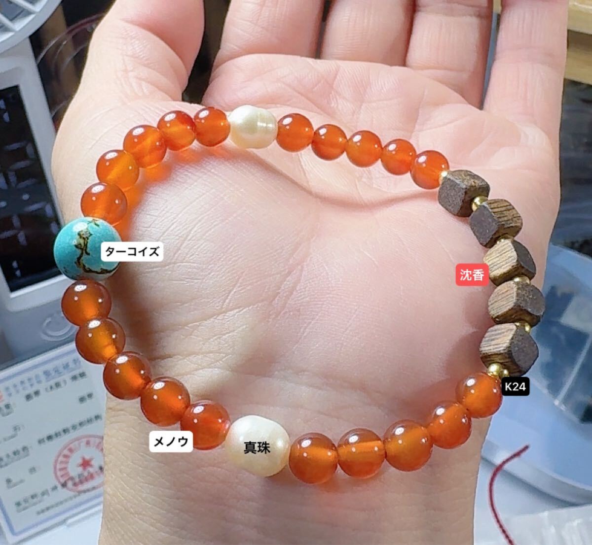 > R2-01205《保証保証》スーパー素材ブレスレット ベトナム産高級 沈香香木 ターコイズ 赤メノウ K24金 画像通り 内周約16cm
