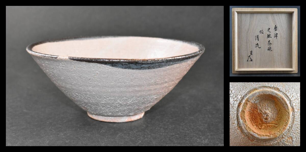 > ■楠廸庵■茶道具 茶碗 平茶碗 中里重利作 皮鯨平茶碗 唐津焼 而妙斎宗員 共箱付 箱書 御物袋付