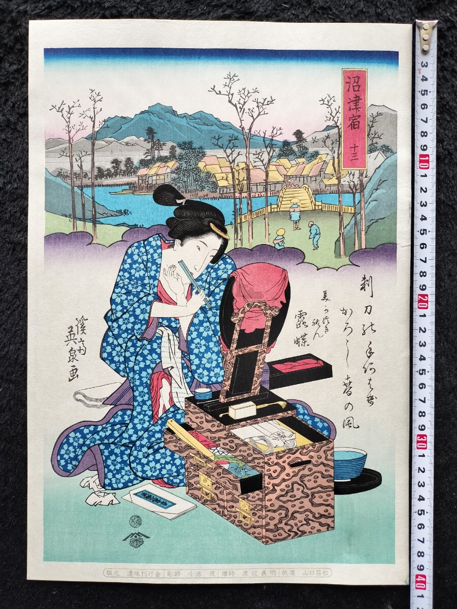 - 【真作】大正期 浮世絵木版画 渓斎英泉「美人東海道 沼津宿」美人図 名所絵 大判 錦絵 保存良い