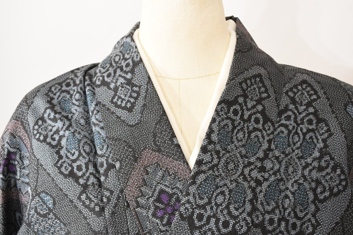 - 大島紬 アンティーク 波 菱文 花 身丈150cm 裄丈65cm ★着物 pb-3520 桜庭呉服店