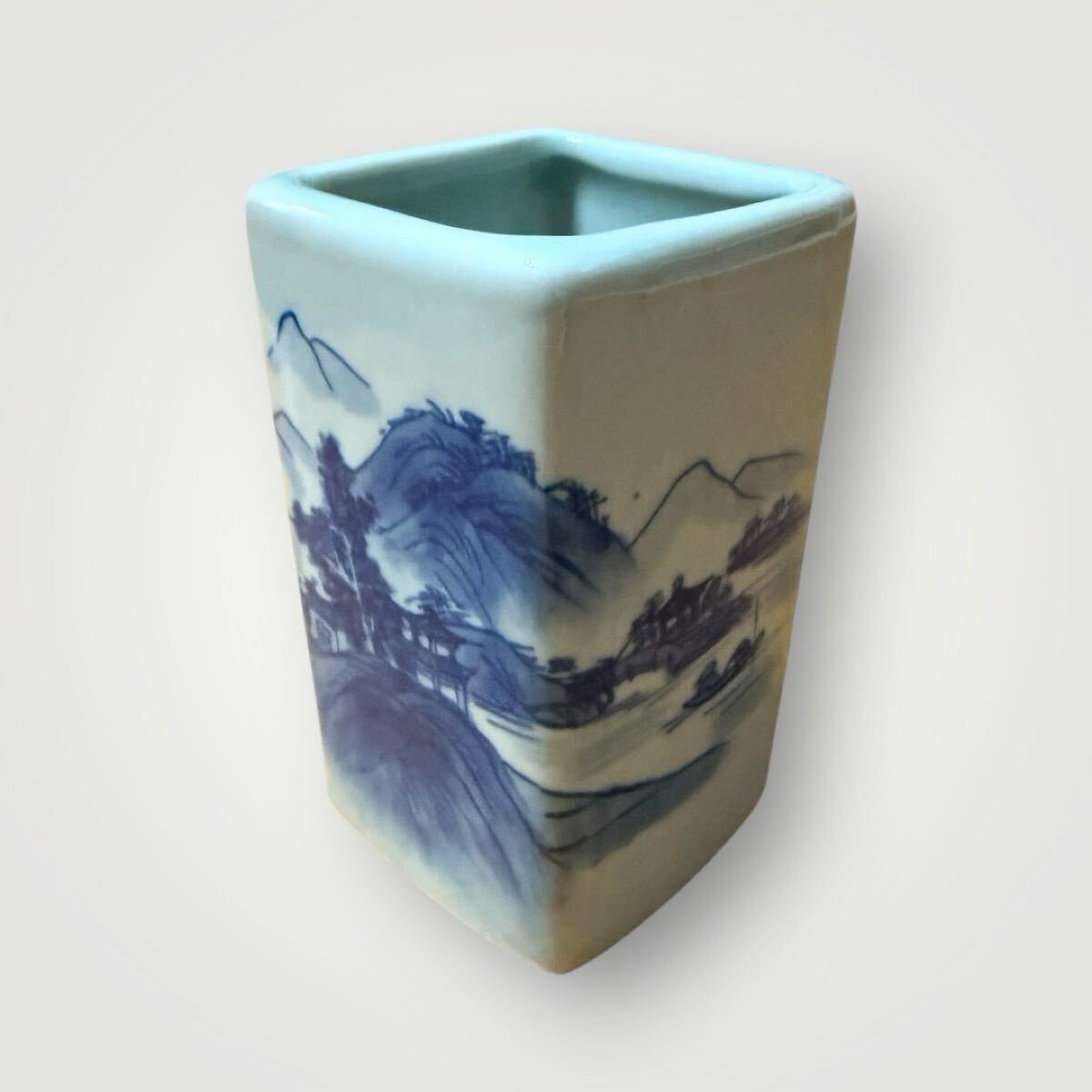- 【NEOJI】時代物 四方筆筒 染付四方山水風景図 筆立 書道具