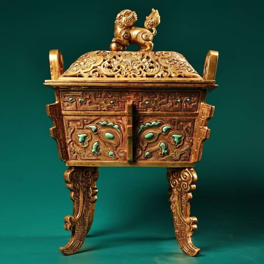 > 清代 乾隆年制 旧蔵 チベット古寺 宮廷御蔵 金象眼宝石方鼎薫香炉 銅製 銅琉金 唐物 收蔵品 時代物 古美術 古置物 希少珍品 供養品 文房具