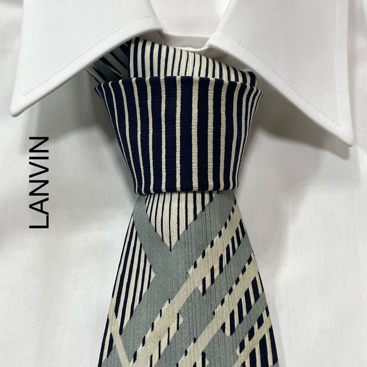 - LANVIN ランバン 変則 ストライプ シルク ネクタイ フランス製 オフホワイト ネイビー グレー TG2340