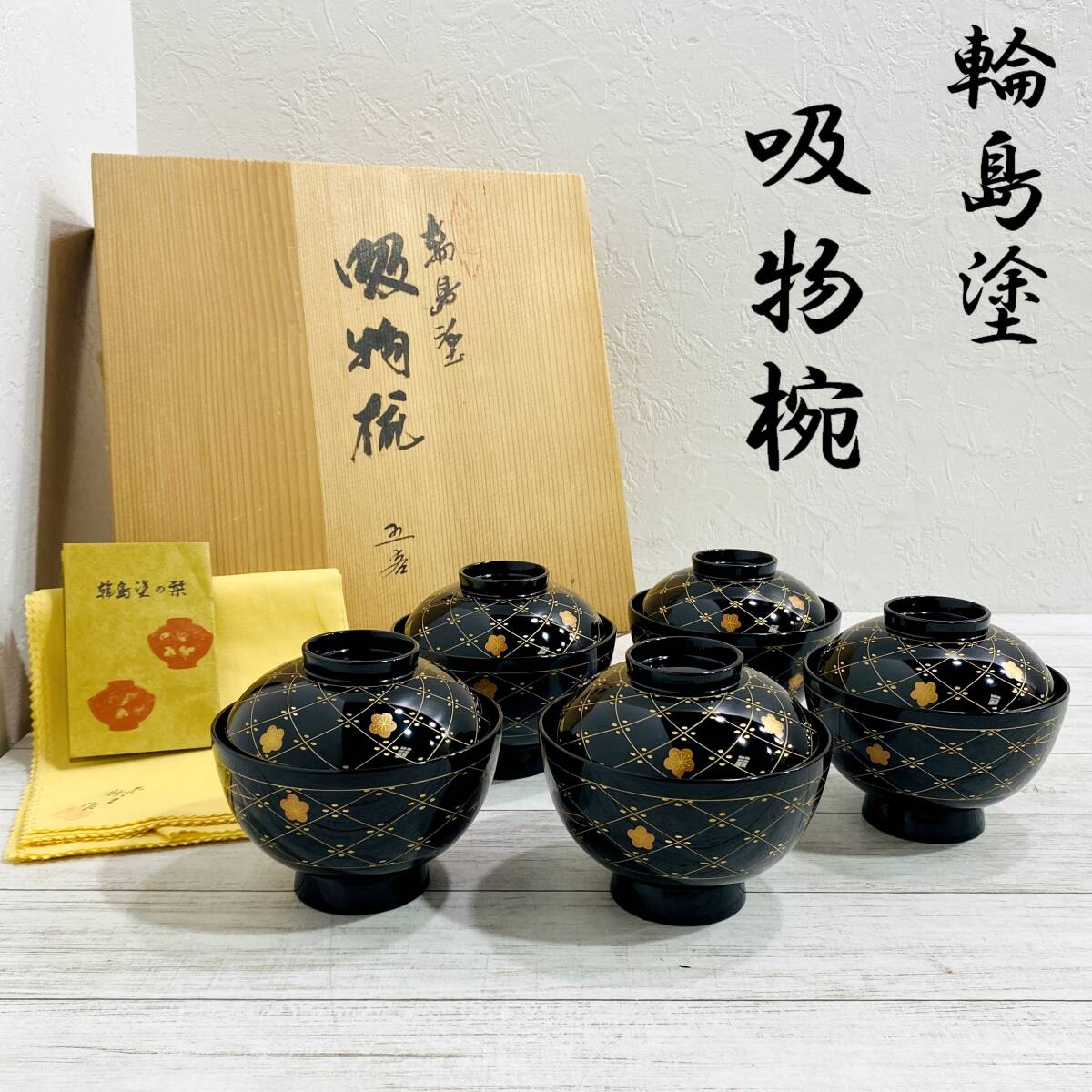 - E0ER0126★未使用保管品★能登/輪島塗/龍作/梅蒔絵/長寿松に梅/吸物椀/五客/共箱/池端漆香堂/能作/金蒔絵/漆塗/漆器/蓋付/汁椀