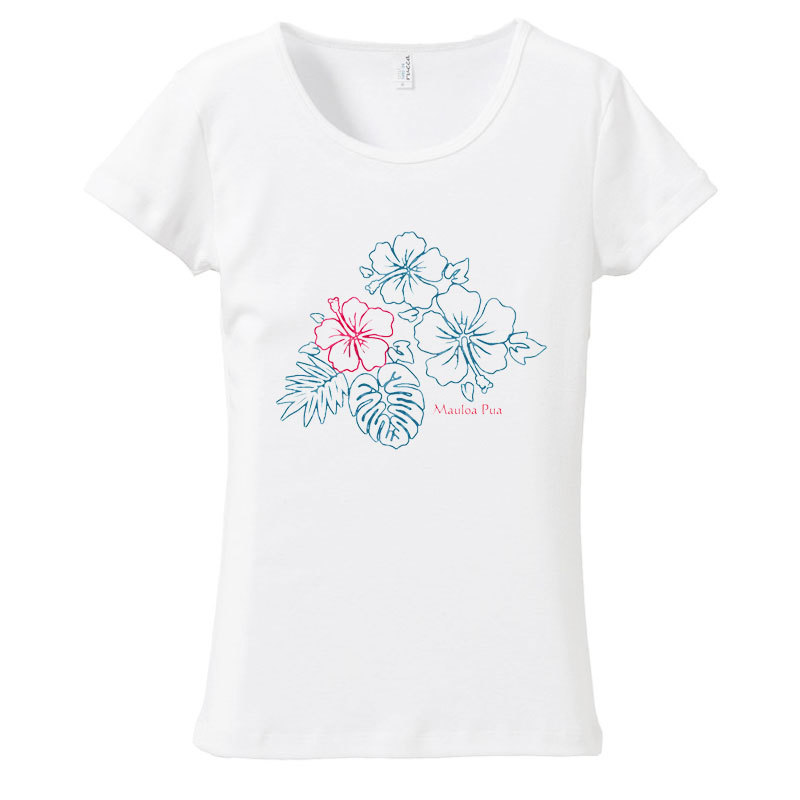 - (M)ホワイト【tf112】ハイビスカスプリント*フラダンスメール便発送Tシャツ半袖送料無料ハウラレディース南国夏ロゴカジュアル