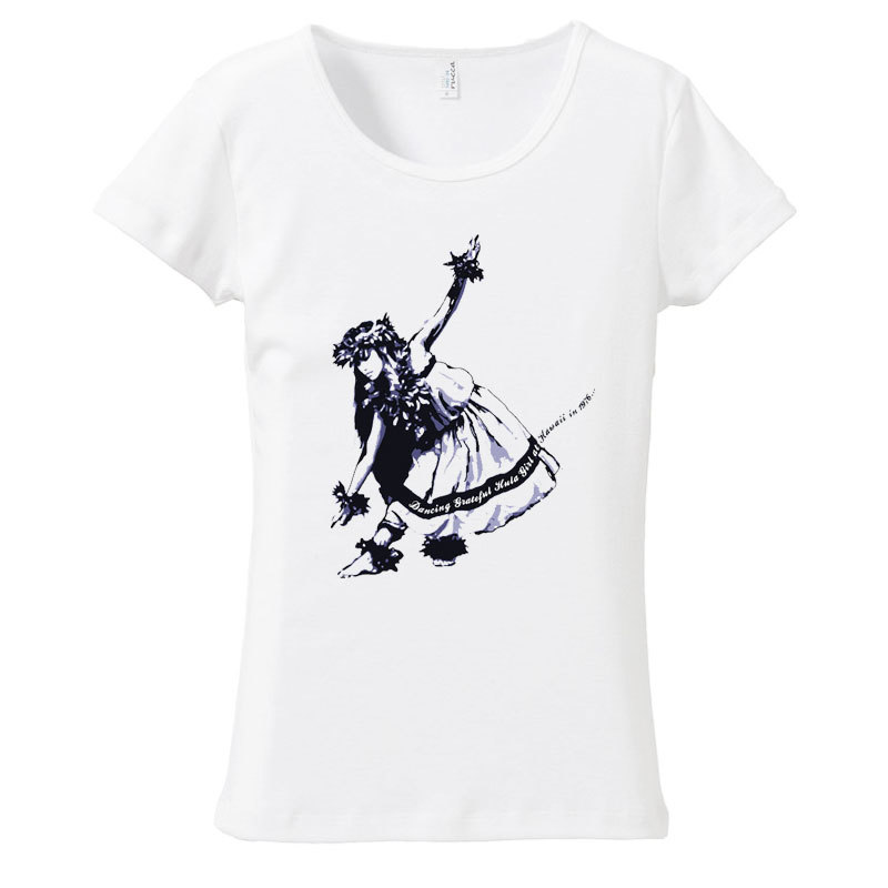 - (L)ホワイト【tf093】ダークネイビー絵画風ダンシングフラガール&ハイビスカス*フラダンス メール便発送Tシャツ半袖送料無料ハワイ夏南国