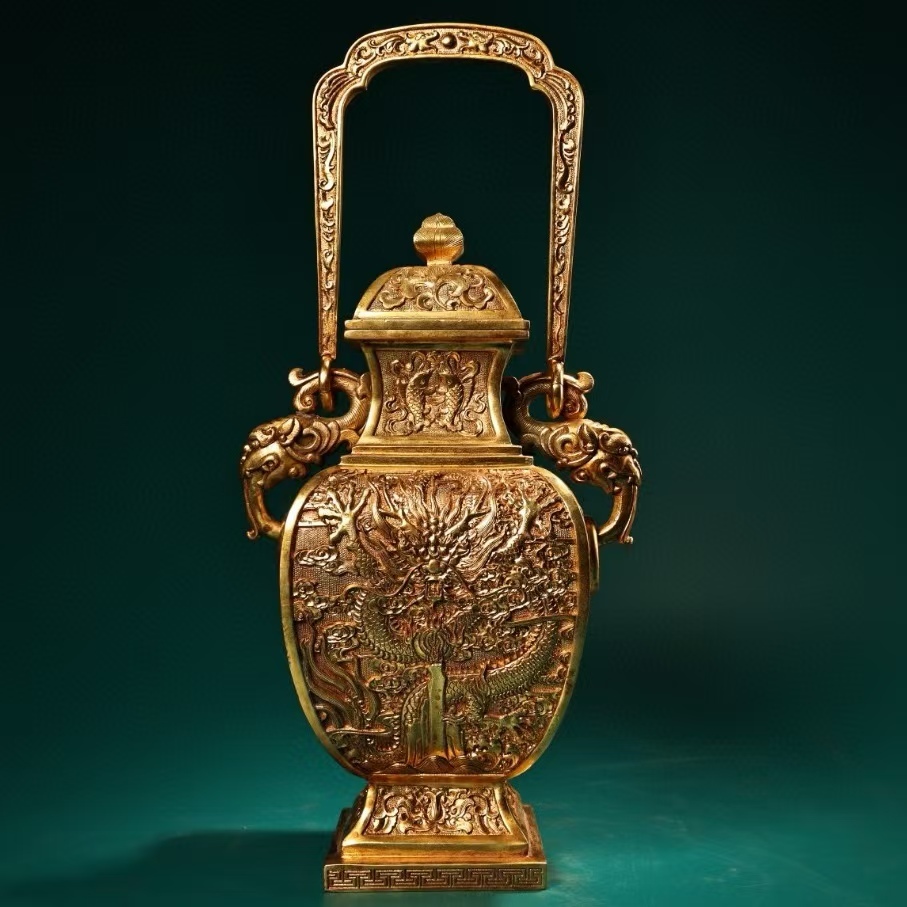 - 仏像 清代 旧蔵 チベット古寺 乾隆年制 古銅エンボス彫刻金提梁神竜花瓶 銅製 銅琉金 唐物 收蔵品 時代物 古美術 古置物 供養品 文房具6.17