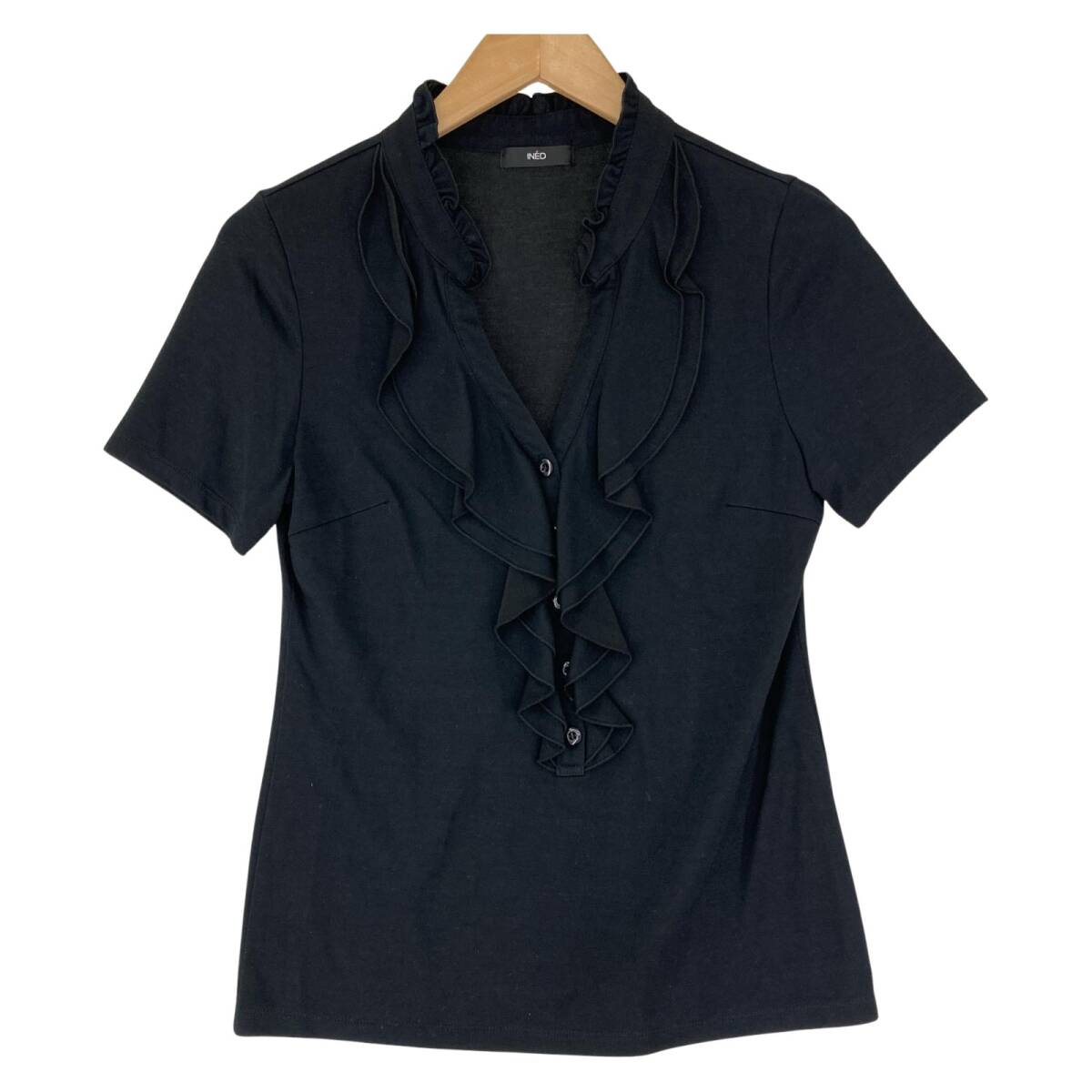 - INED イネド 半袖 Vネック フリル カットソー size9/ブラック