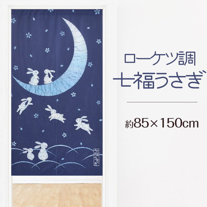 - 和柄のれん85x150cmローケツ調七福うさぎブルー-niil