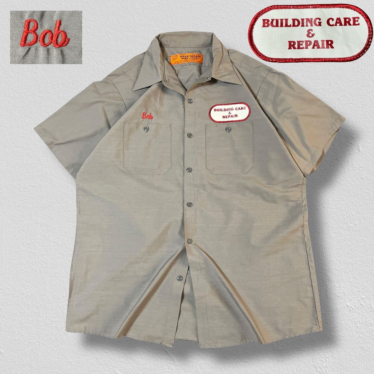 > WEAR-GUARD WORK CLOTHES 半袖ワークシャツ ワッペン BUILDING&CAREREPAIR Bob グレージュ L●洗濯プレス済●ネコポス可●シャツ 古着/381