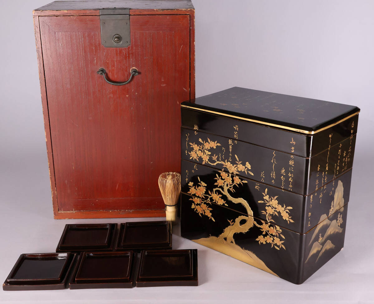 - 漆芸 時代 蒔絵野弁当 四段重箱 草花 金蒔絵 木皿10枚 木箱 木製漆器 和歌 詩歌 桜 撫子 蛍 菊 段重 菓子器 黒塗【MA695】
