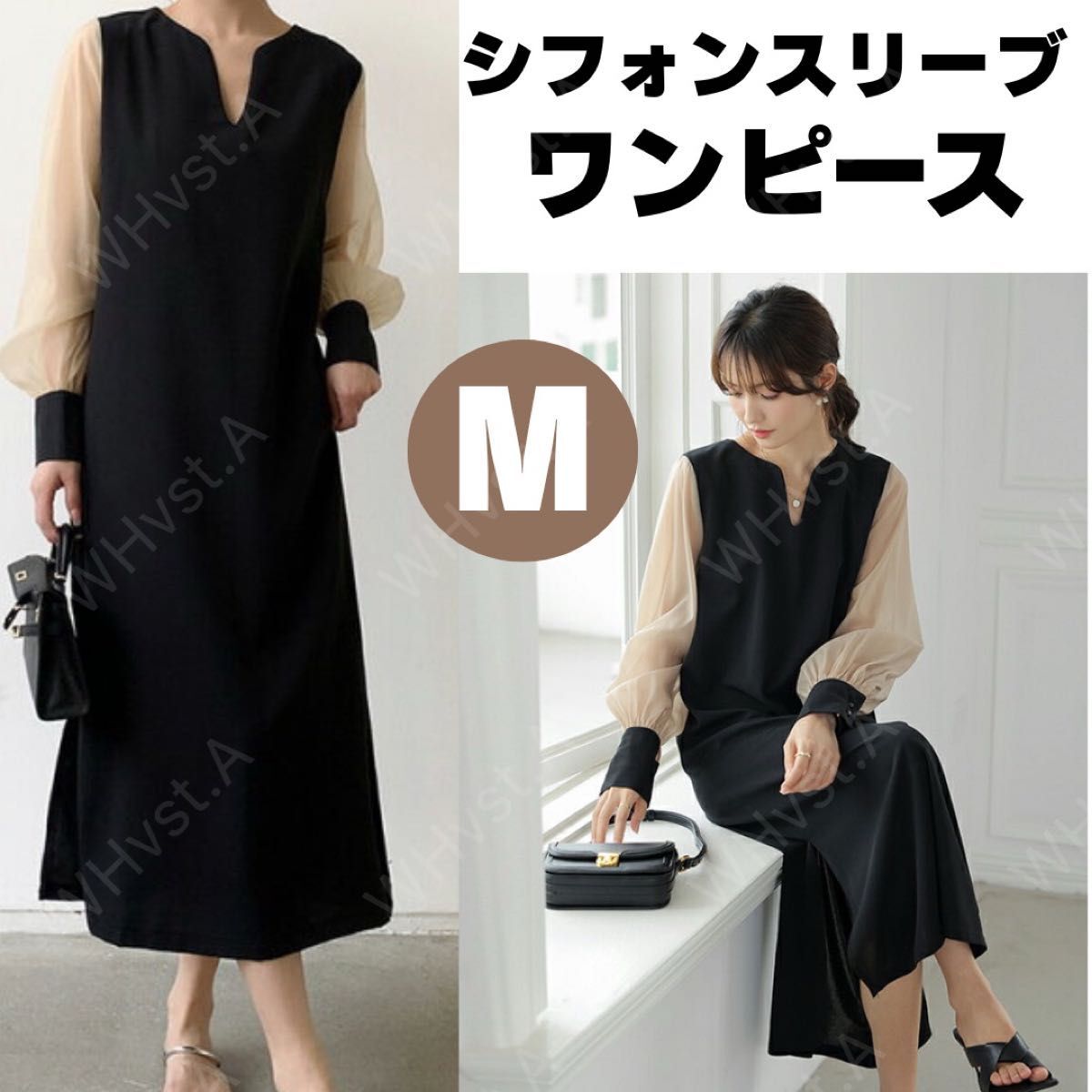 - ワンピース エレガント 黒 ベージュ M Vネック フォーマル エレガントロング お呼ばれ シアー袖 上品