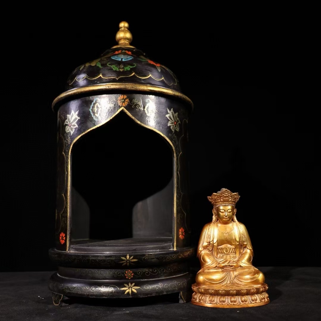 - 仏像 古木彫り 秘藏 清代 古木仏壇古銅観音菩薩仏像一式 書道具 文房具 時代物 中国古美術 細密彫 置物 賞物 唐物 木彫り 文玩 仏教 6.5