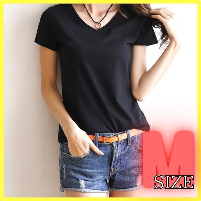 > M ブラック Tシャツ 半袖 カットソー 薄手 レディース インナー シャツ Vネック 黒 シンプル