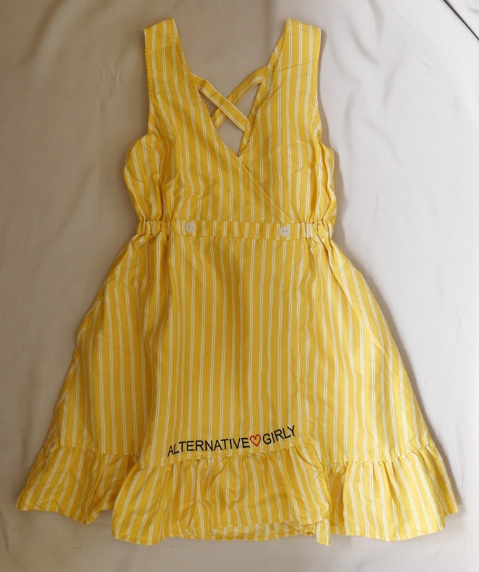 > ALGY ワンピース フレアスカート フリフリ イエロー ストライプ 古着 USED キッズ 女の子 普段使い 普段着 かわいい 格安 プチプラ 子供服