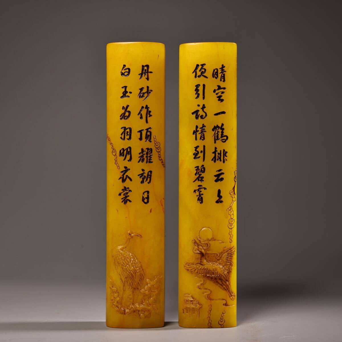 - 蔵友旧蔵出 寿山石 田黄石 細密彫 詩詞賦 雲鶴紋 印章一對 箱付 貴重品 稀少物品 置物 賞物 中国時代美術品