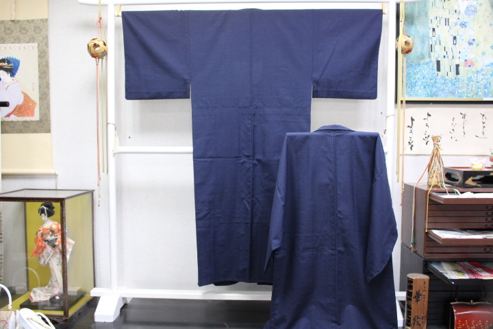 - きもの今昔8657 男の和服 お召地シルクウールアンサンブル 濃紺色に横にネップいり美品 きもの丈143cm